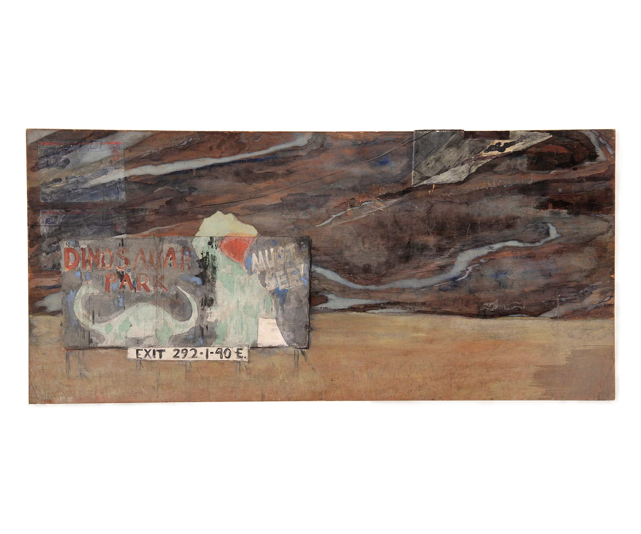 Dino Sign, 2013, watercolor, touche, and paper on panel, 15 x 32 x 1 inches