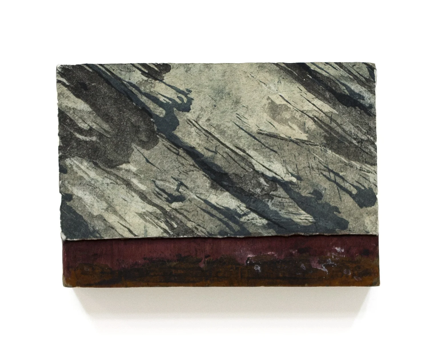 Clouds and Horizon, 2013, etching, collage, and watercolor on panel, 5.75 x 7.75 x 1.75 inches