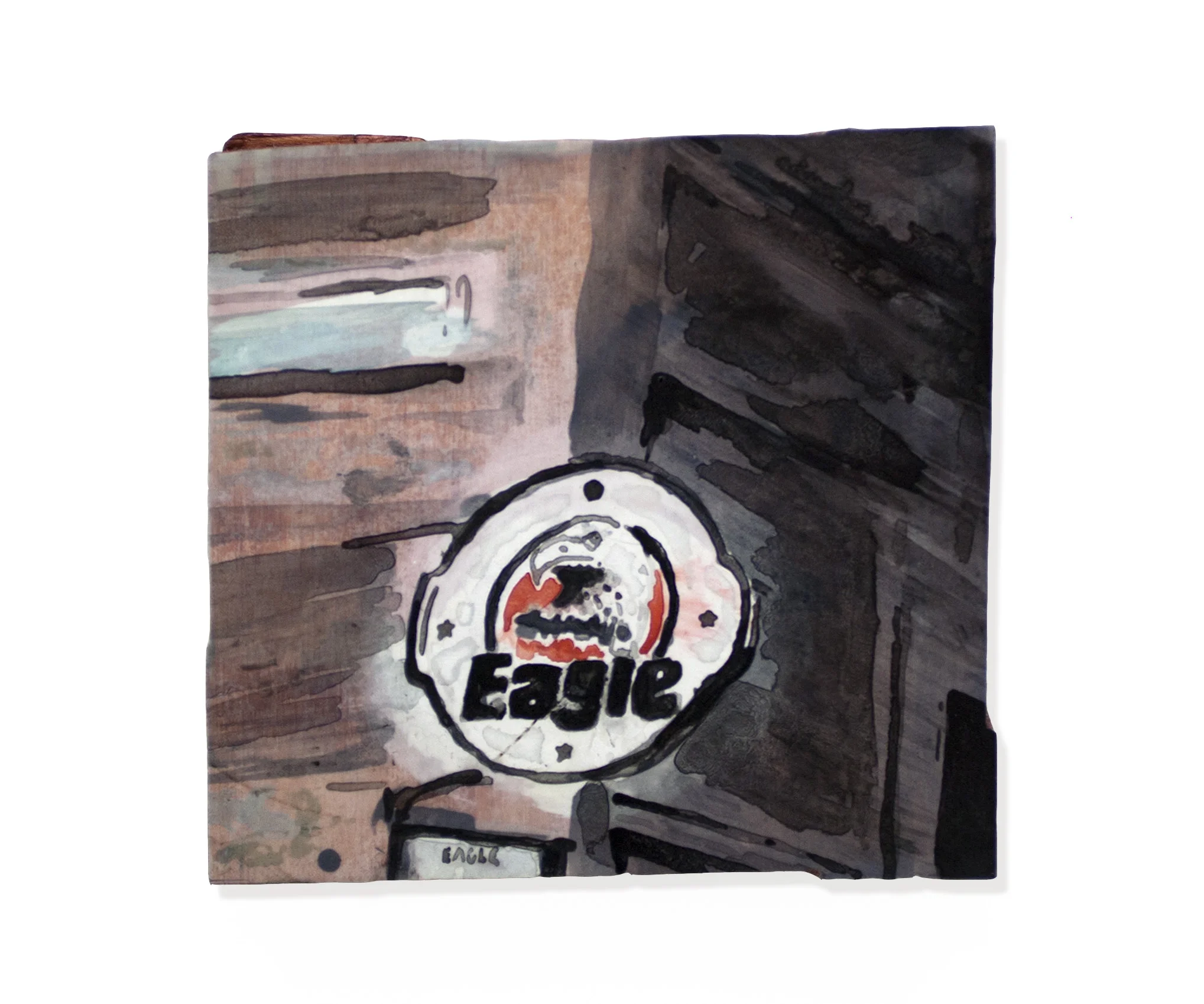 Eagle Gas Sign, 2015, watercolor and gouache on mylar mounted on panel with spray resin, 8.5 x 9 x 2.25 inches
