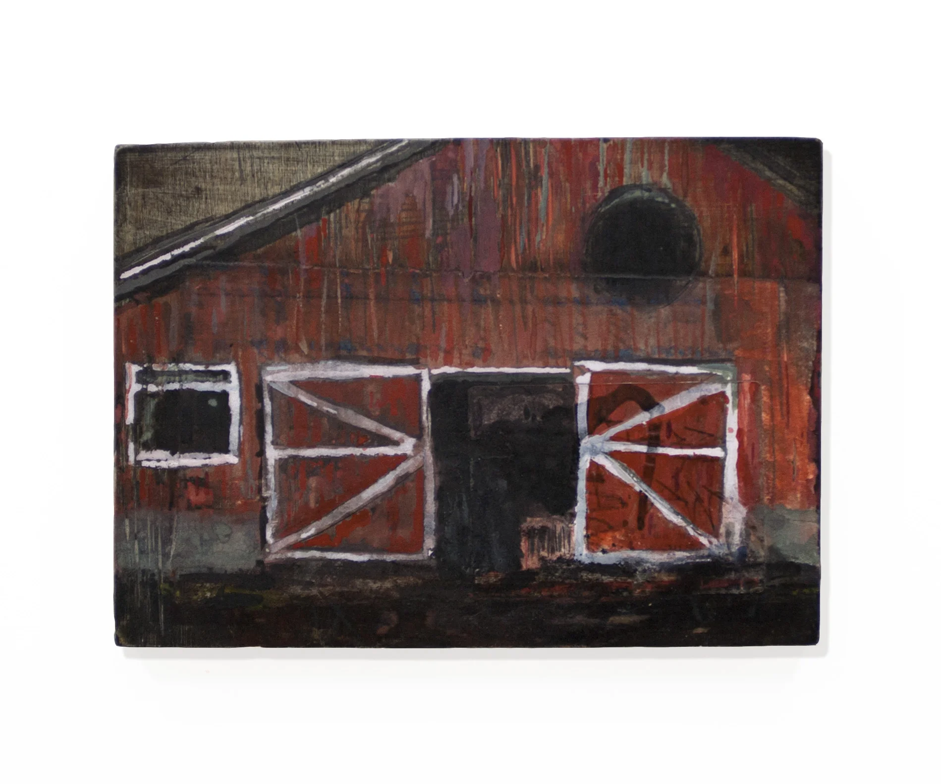 Barnfront, 2014, watercolor, acrylic, gouache, and collage on panel, 8 x 11 x 1.5 inches