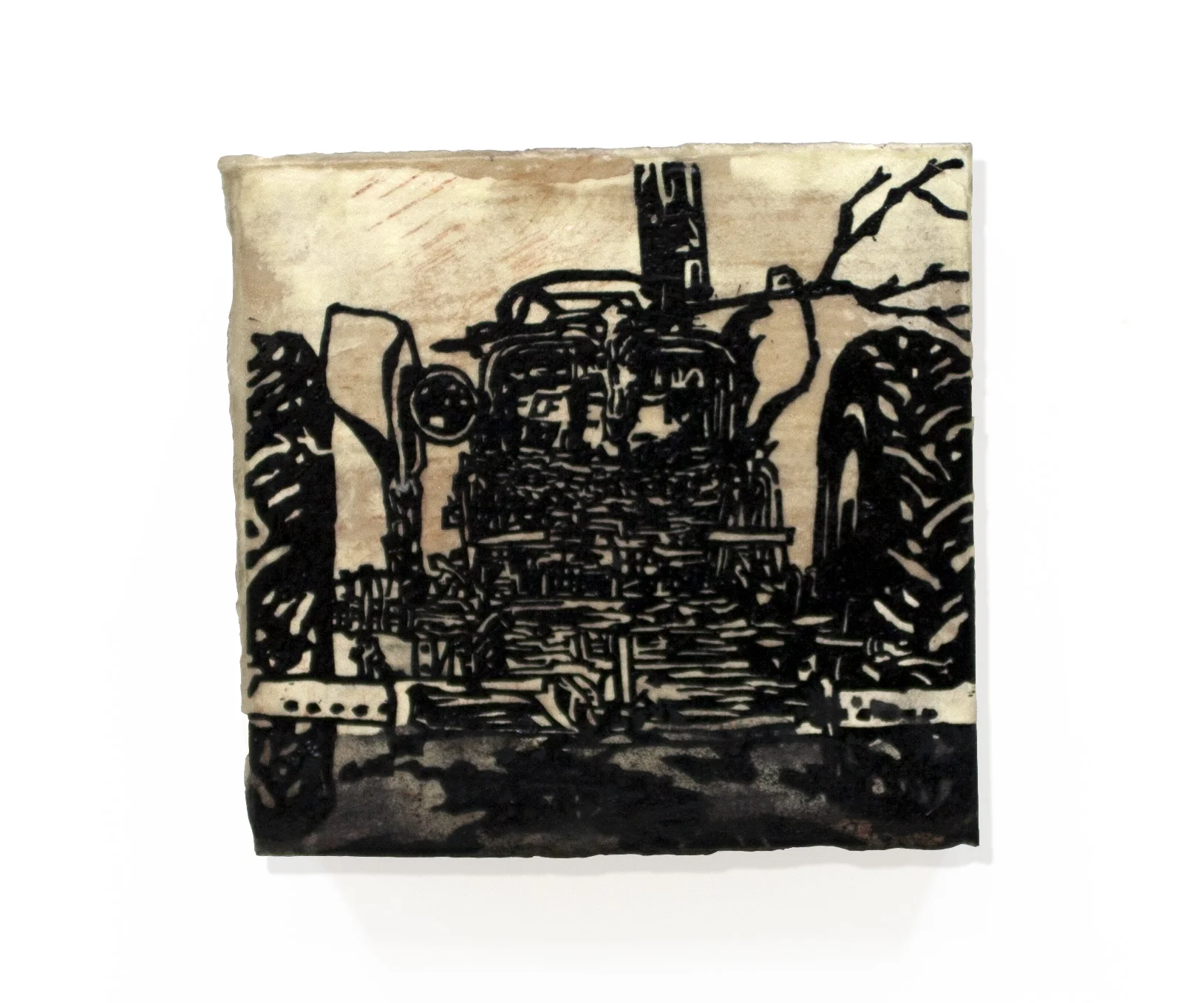 Tractor Front, 2014, woodcut and watercolor mounted on panel with resin, 7 x 7.5 x 3 inches