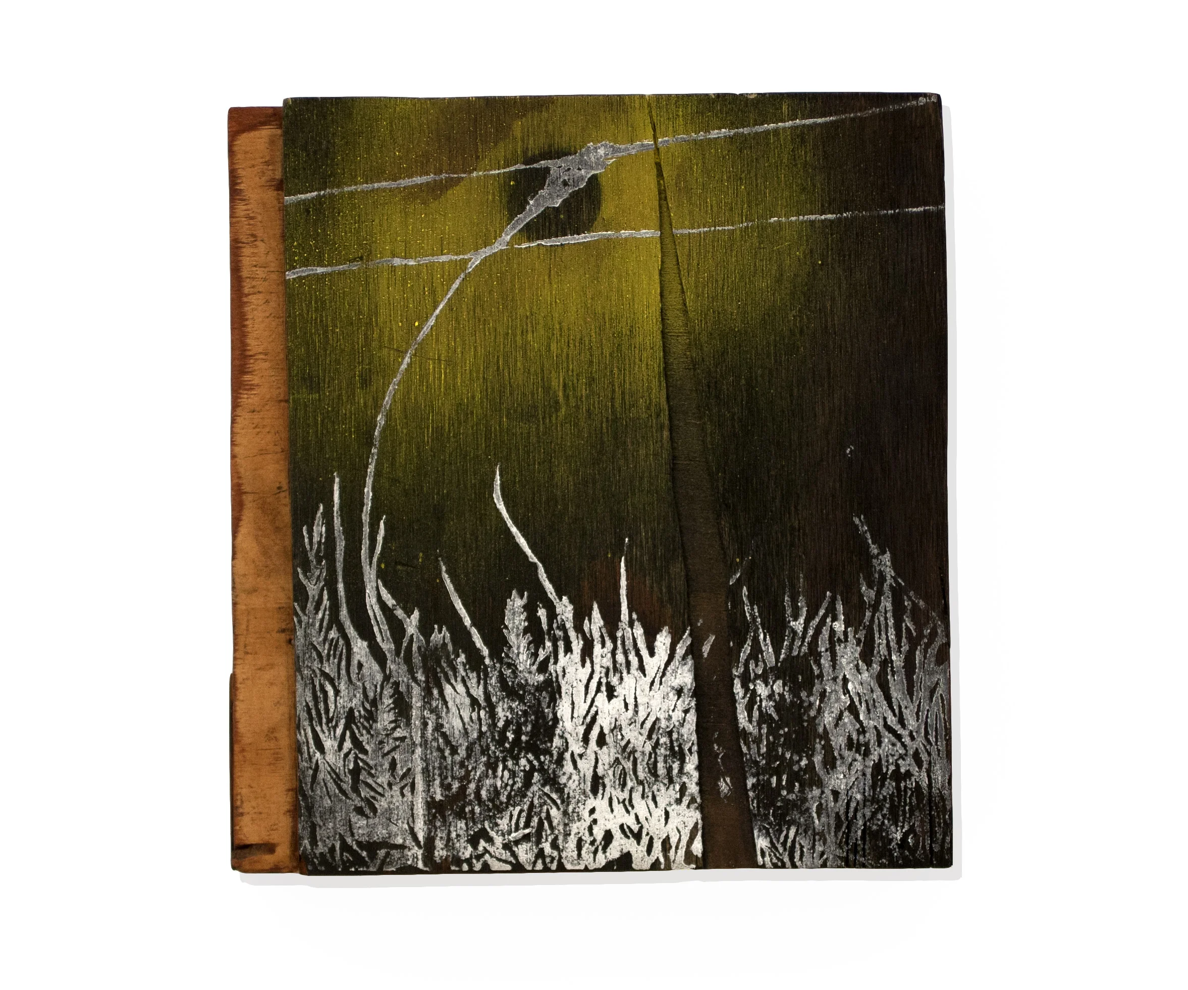 Grass and Powerlines, 2014, spray paint, linocut, and stain on wood
