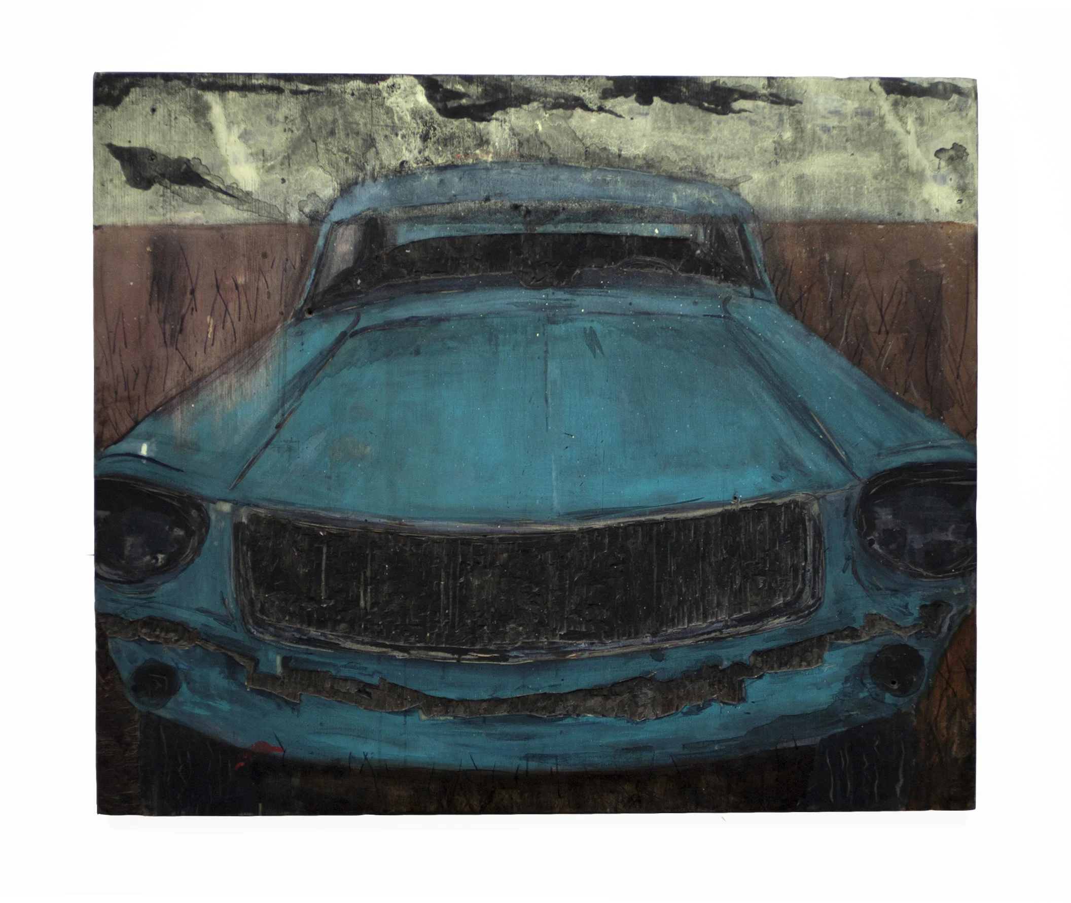 Benny's Dream Ride, 2015, watercolor, gouache, acrylic, and spray paint on wood panel, 28 x 33.5 inches