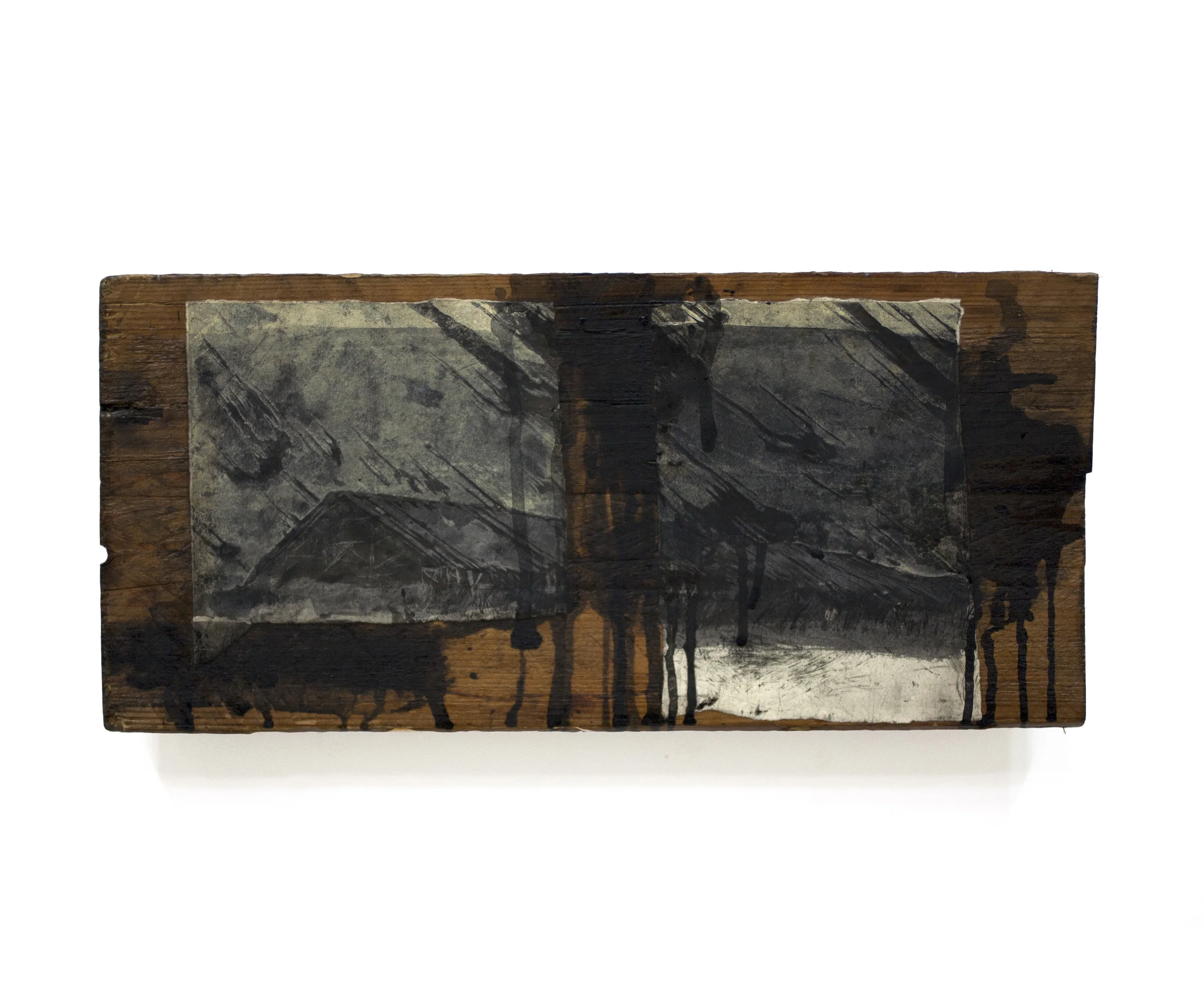 Barn in Dark Clouds, 2014, etching and acrylic on wood, 9.5 x 21 x 3 inches