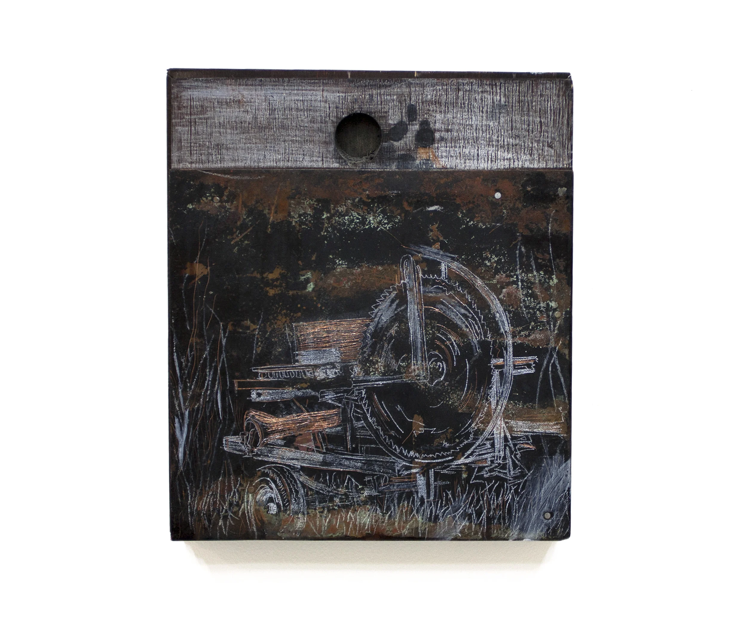 Meth Saw, 2014, transfer drawing on copper plate mounted on wood, 8.5 x 8.5 x 2.5 inches